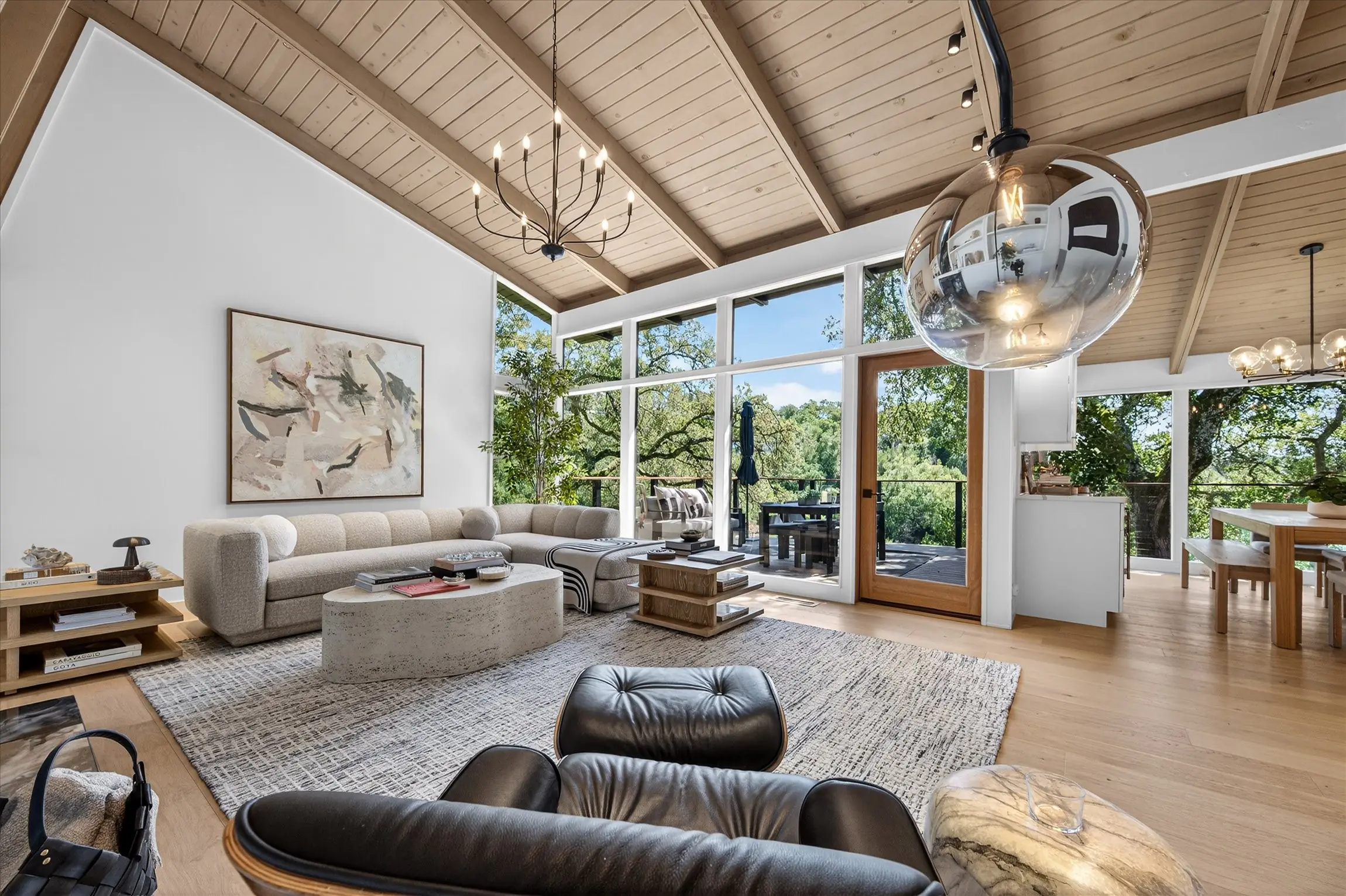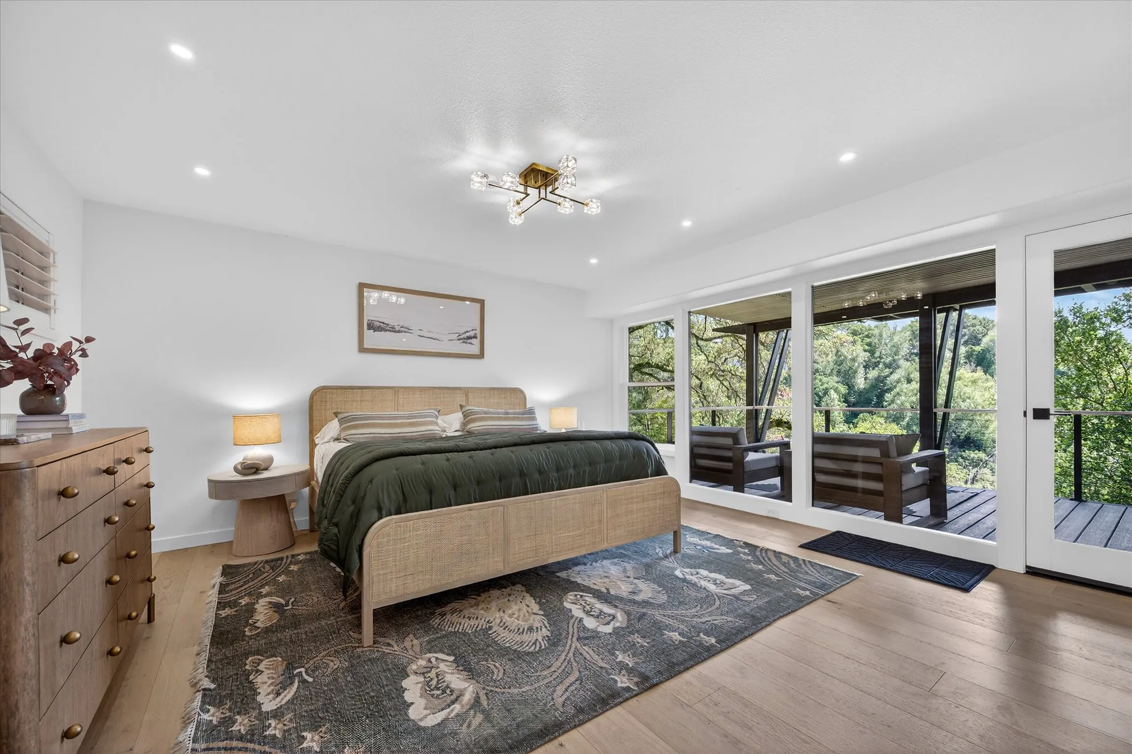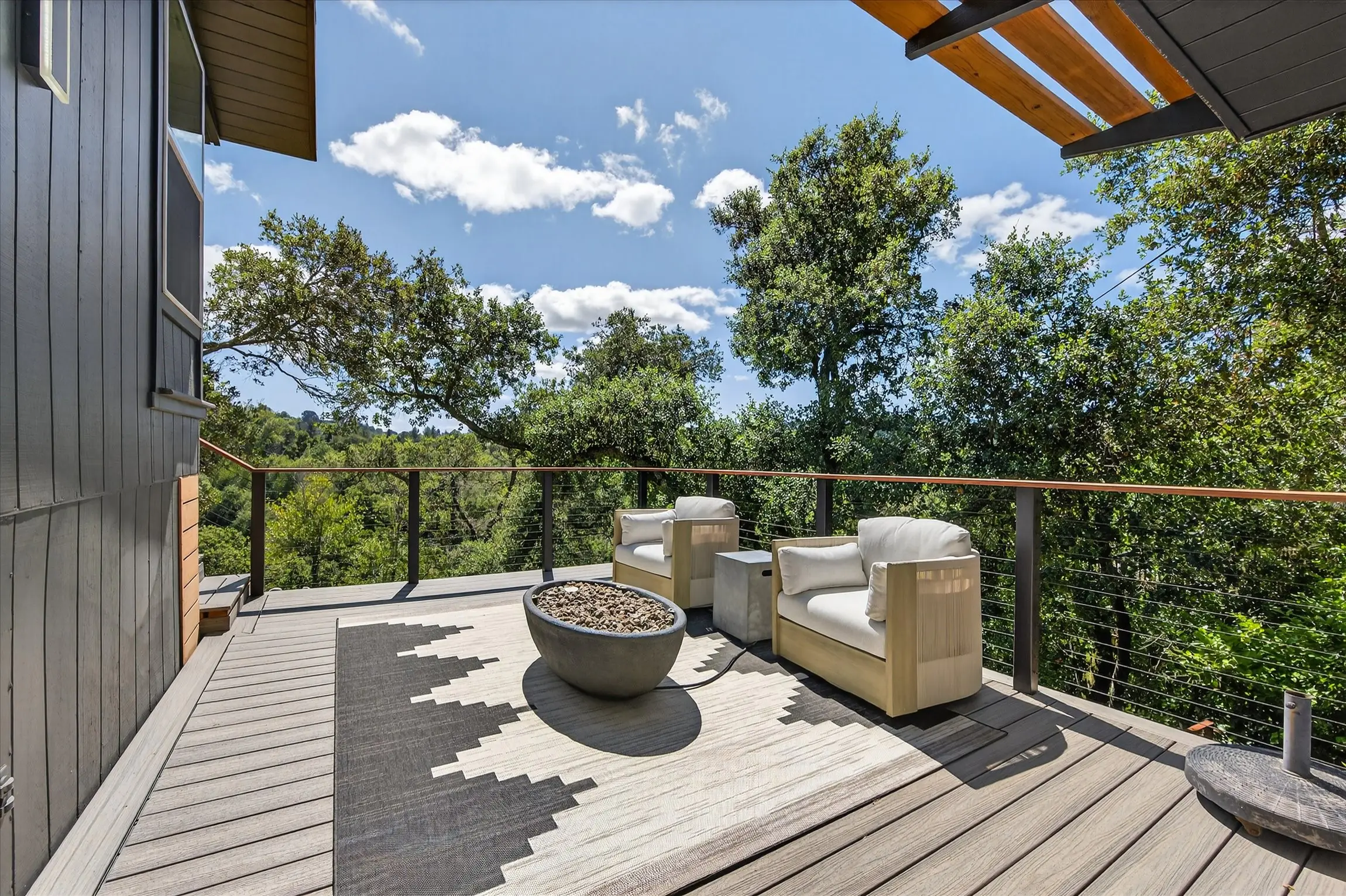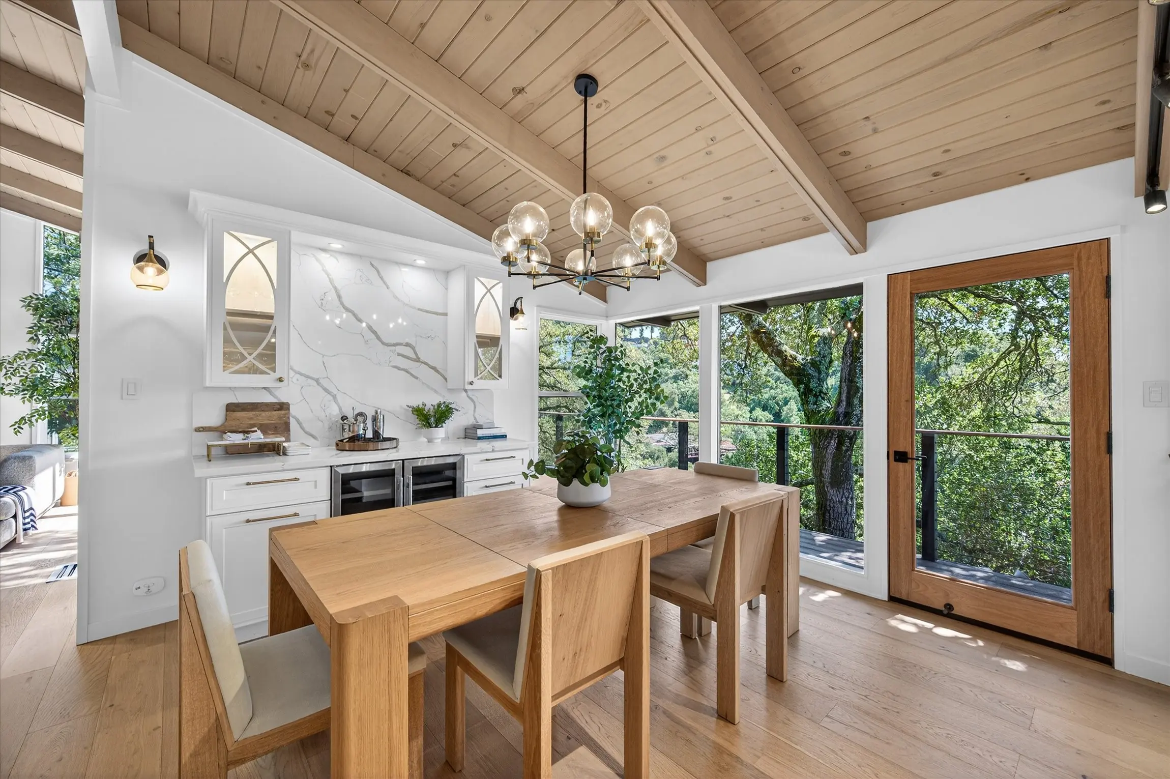Fully remodeled from top to bottom, this stunning 4-bedroom, 3.5 bath Orinda Country Club mid-century retreat offers approximately 2,559 sq ft of beautifully updated living space on a private .39-acre lot surrounded by majestic heritage oak trees and classic Orinda views. The light-filled open main level features soaring ceilings, a dramatic marble-faced fireplace, expansive picture windows, new wood flooring, and an updated kitchen with stainless steel appliances, all opening to expansive decks with a barbecue area for seamless indoor-outdoor living. The private primary suite includes its own deck and beautifully appointed bath with large windows framing the natural landscape. Additional highlights include a hidden wine cellar with adjacent storage, level front yard, smart lighting with touch-activated stair illumination and centralized controls, and a two-car garage. Tucked away yet minutes to Orinda Country Club, BART, Highway 24, the Village, and top-rated Orinda schools including Sleepy Hollow Elementary, Orinda Intermediate, and Miramonte High School.