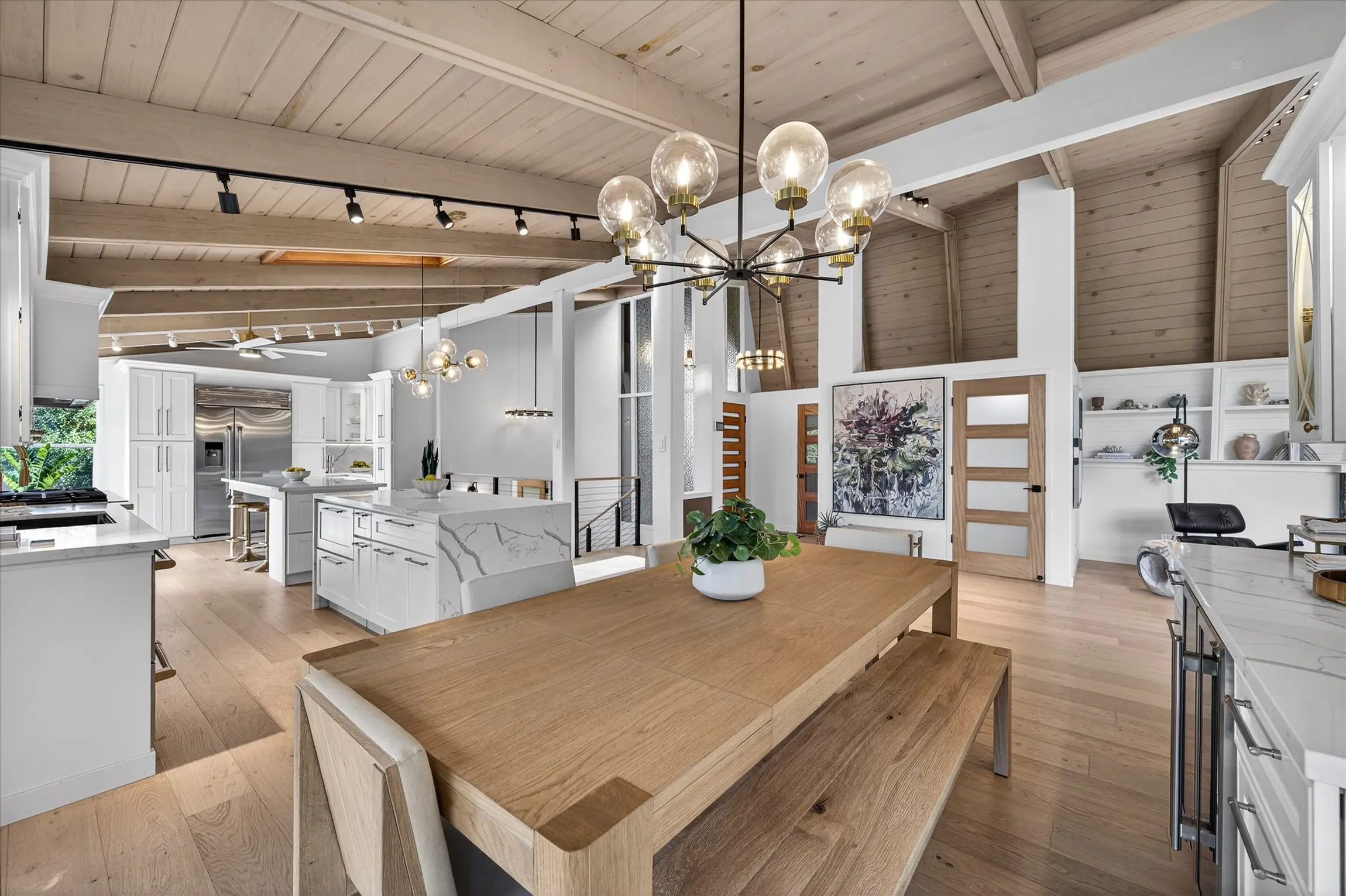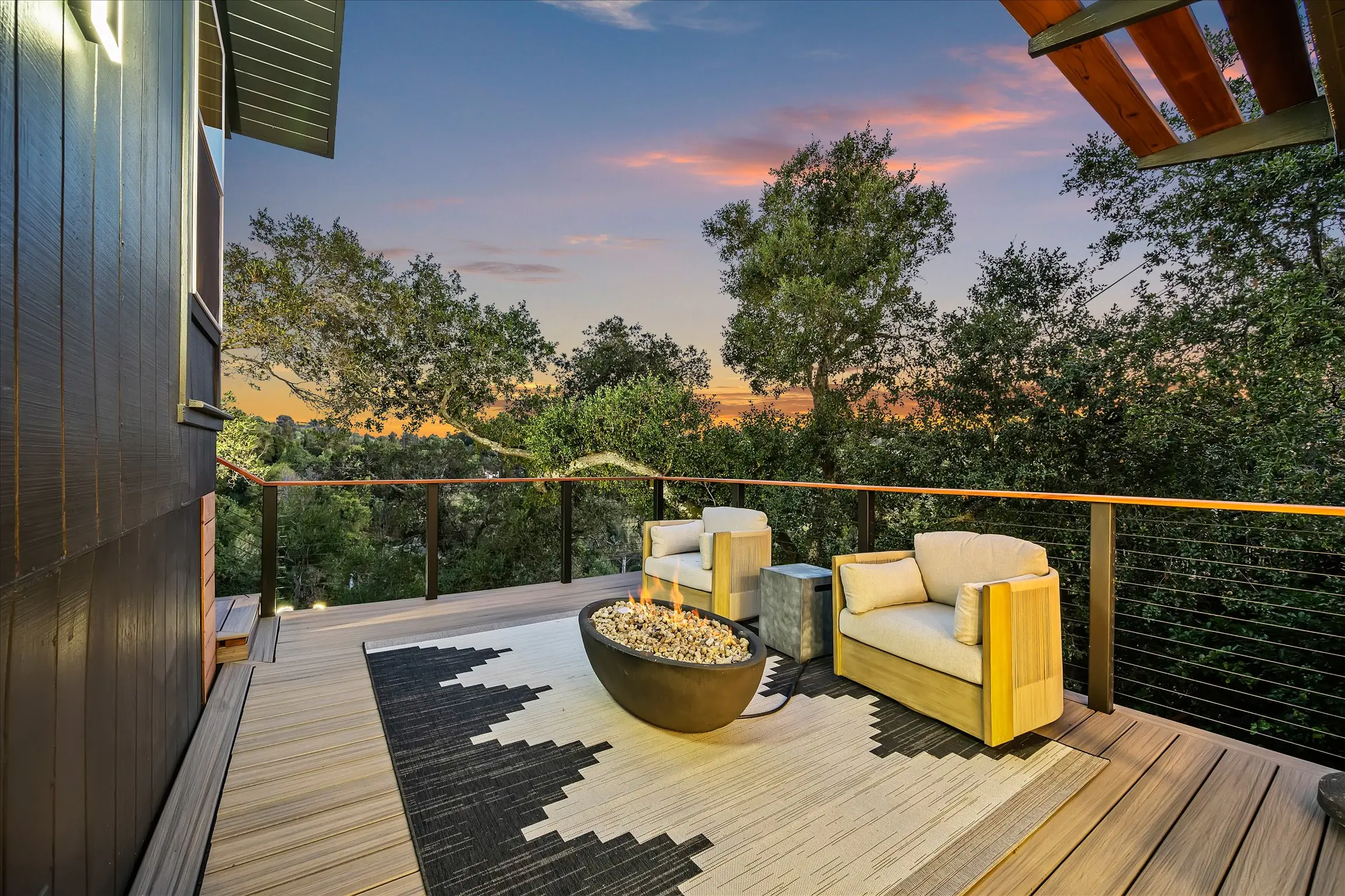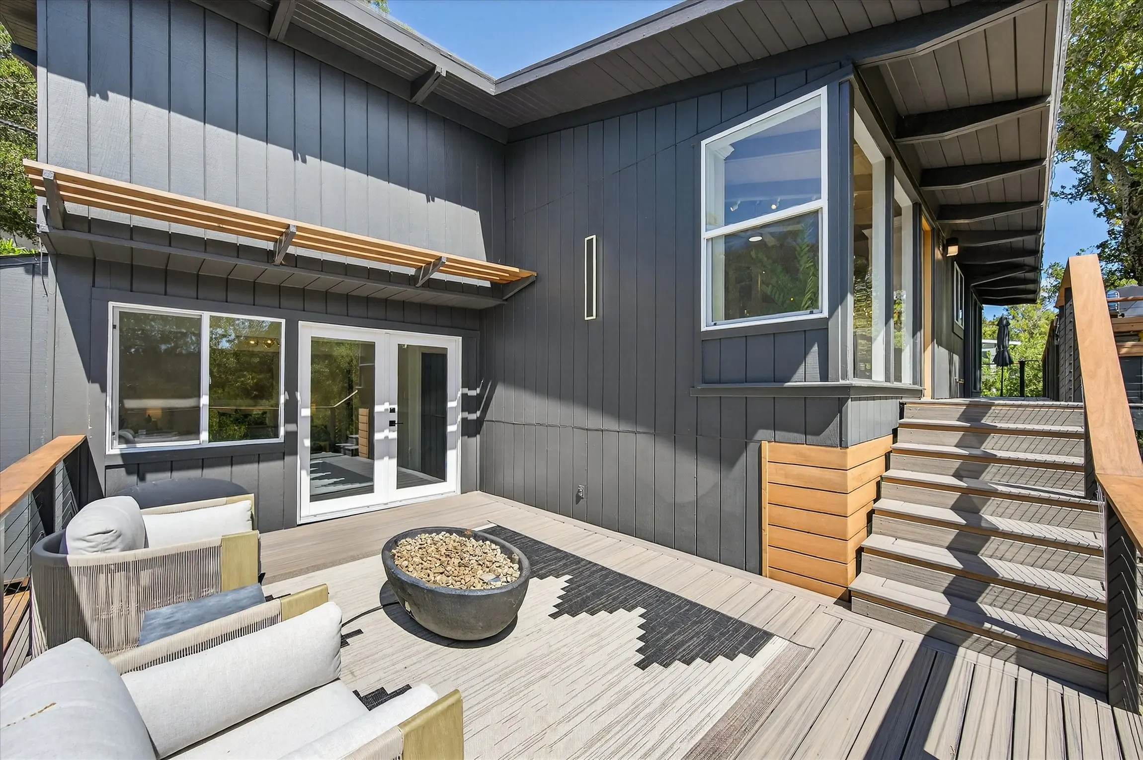 Fully remodeled from top to bottom, this stunning 4-bedroom, 3.5 bath Orinda Country Club mid-century retreat offers approximately 2,559 sq ft of beautifully updated living space on a private .39-acre lot surrounded by majestic heritage oak trees and classic Orinda views. The light-filled open main level features soaring ceilings, a dramatic marble-faced fireplace, expansive picture windows, new wood flooring, and an updated kitchen with stainless steel appliances, all opening to expansive decks with a barbecue area for seamless indoor-outdoor living. The private primary suite includes its own deck and beautifully appointed bath with large windows framing the natural landscape. Additional highlights include a hidden wine cellar with adjacent storage, level front yard, smart lighting with touch-activated stair illumination and centralized controls, and a two-car garage. Tucked away yet minutes to Orinda Country Club, BART, Highway 24, the Village, and top-rated Orinda schools including Sleepy Hollow Elementary, Orinda Intermediate, and Miramonte High School.